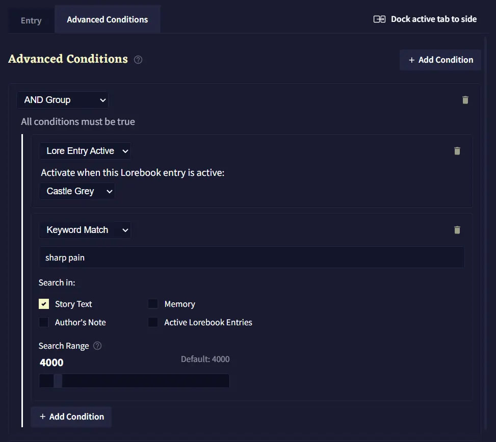 In the Advanced Conditions tab you can add additional conditions under which the Lorebook entry should get activated. This allows you to link together entries or specify activation keywords in a more fine-grained manner.